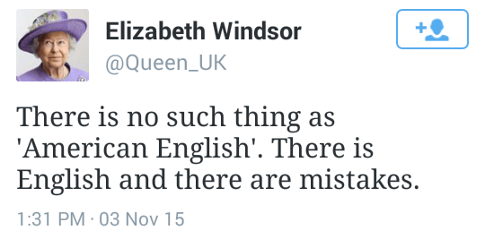 最后附上一个关于美式英语和英式英语之争的最霸气答案,出自于英语女王伊丽莎白二世的第一条推特,请看: