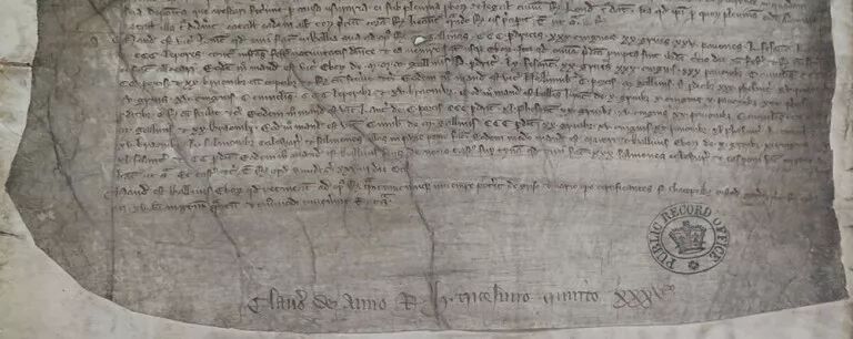 克拉伦斯公爵莱昂内尔的代理人托马斯·德·戴尔的收据和印章,上面是国王给沃尔特·德·巴德斯的56英镑8先令11便士,外加米兰领主加莱亚佐给公爵结婚用的17500马克(折合11500英镑,约合今天420万英镑)。伦敦,1368年5月20日(E 42/233)